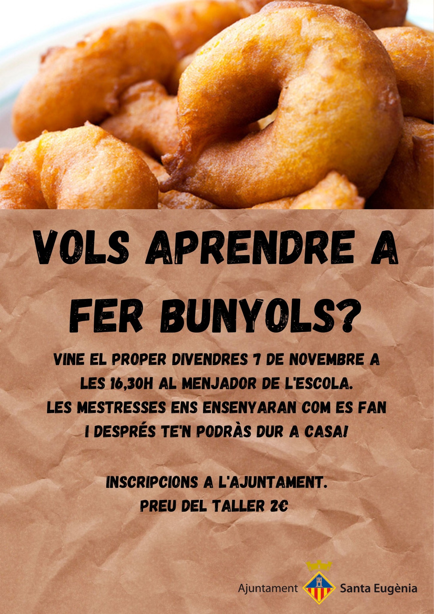 El proper divendres dia 7 de novembre a les 16,30h tendreu l'oportunitat d'aprendre a fer bunyols de les mans de les Mestresses de Casa de Santa Eugènia.